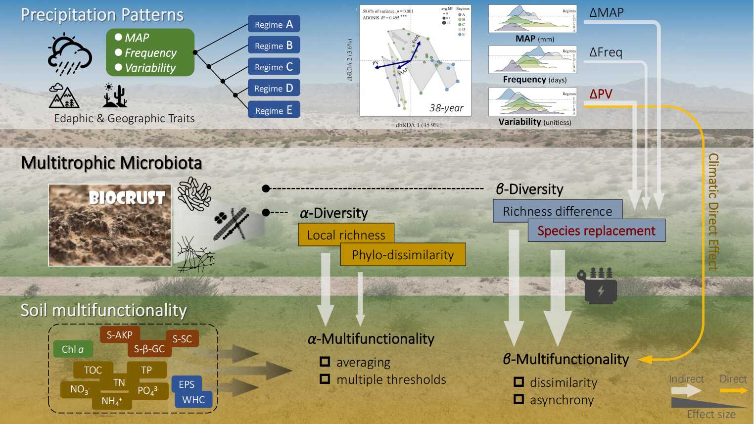 中國科學院水生生物研究所特殊環境藻類生物學研究團隊,以我國西北干旱區為研究對象,結合38年高精度歷史氣象數據與多營養級微生物群落特征分析,系統揭示了降水多維度特征通過微生物多樣性調控荒漠生物結皮多功能性的級聯機制(圖1)。相關研究成果以"Multifaceted precipitation patterns impact biocrust functionality in drylands: A cascade of variability via species replacement in soil microbiota"為題,近期發表于生態學期刊《Global Ecology and Biogeography》。