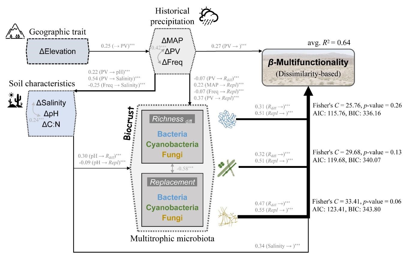圖3. 氣候環境異質性與多營養級微生物β多樣性組分對多功能性差異的級聯效應