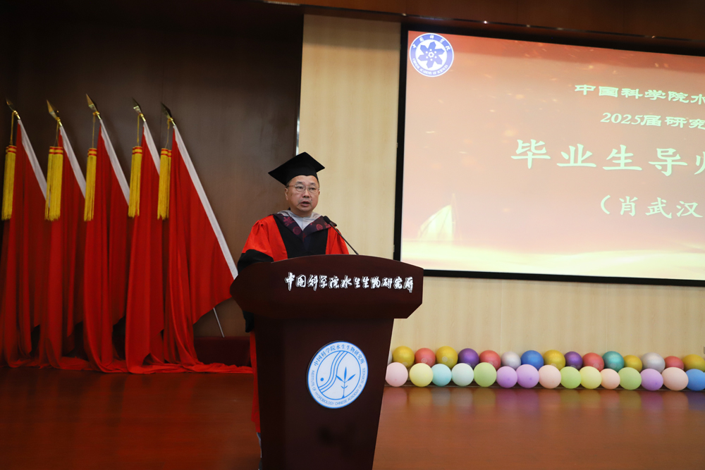 畢業生導師代表肖武漢研究員登臺,用飽含深情與期許的話語為學子送上臨別箴言。他回顧了同學們在水生所“用汗水澆灌夢想,以勤奮書寫青春”的奮斗歷程,稱贊他們在實驗室燈火、野外跋涉與學術思辨中完成了“從青澀走向成熟的蛻變”。他特別勉勵畢業生永葆“三顆赤子之心”——“求知若渴的學習心、銳意進取的創新心、兼濟天下的責任心”,既要有強健體魄和堅韌內心,更要以溫暖愛心照亮他人,在時代洪流中“譜寫出屬于這個時代的最美樂章”。