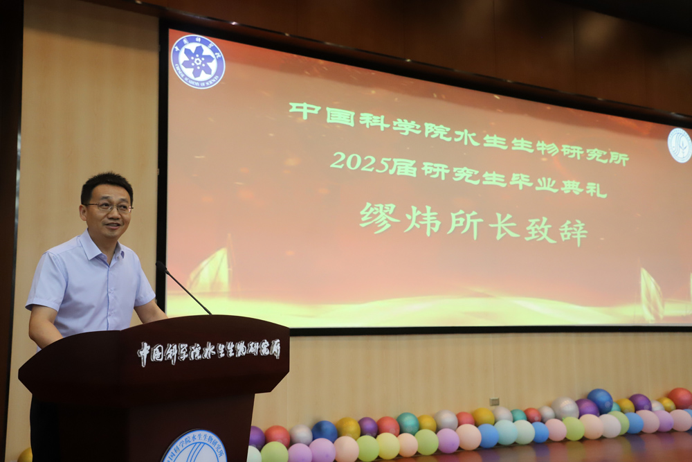 繆煒所長在致辭中與同學們共同追憶了初入所時的青澀、節慶的溫暖以及科研路上的艱辛與榮光,正是這些“平凡而炙熱的瞬間”——顯微鏡下的探索、凌晨漁房的堅守、為實驗成敗的悲喜——匯聚成水生所的科研長河。他借用歌詞“我敬你一杯酒,敬你的沉默和每一聲怒吼”表達對畢業生付出的肯定,賦予他們“水生所人”的光榮身份。繆煒勉勵大家 “平凡不等于平庸,無名不等于無光”,國家“綠水青山,魚兒滿倉”的宏愿需要無數人默默添磚加瓦。他期待畢業生們以“無名人”的姿態投身祖國事業,“散發微光,匯聚水生所之光”,并深情祝福:“車開了,往前,帶著你的夢,發著你的光。”