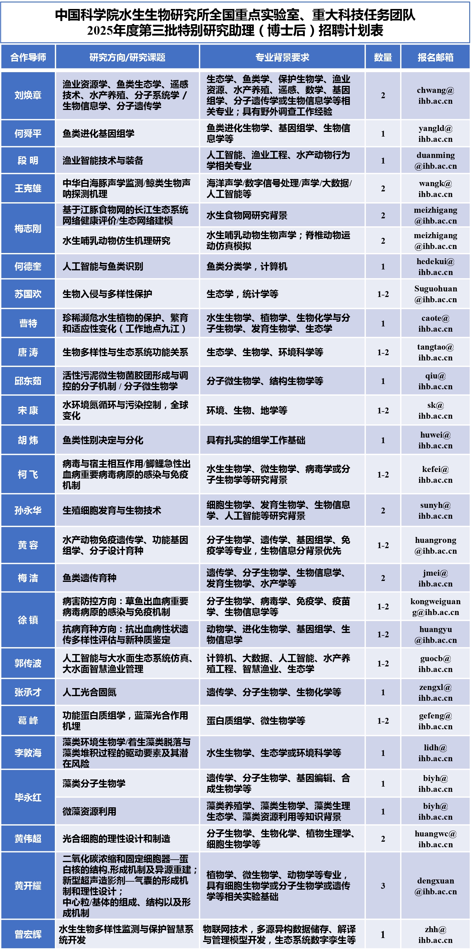 1.?水生生物學、遺傳學、水產學、微生物學、分子生物學、細胞生物學、病毒學、生理學、動物學、植物學、漁業工程、遙感、生態學、環境科學、環境工程、保護生物學、聲學、水文學、統計學、大數據、計算機科學、人工智能、基因組學、生物信息等相關專業博士或應屆博士畢業生。